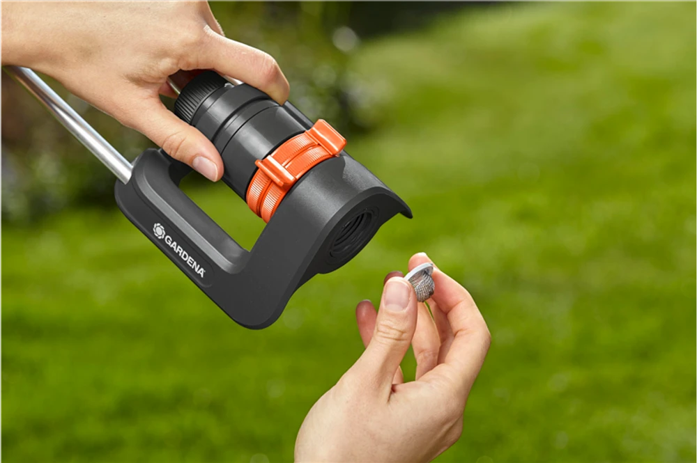 Made from durable materials including metal components, the Aqua M Sprinkler remains firmly on the ground and is protected against frost. Its built-in fine-mesh stainless steel filter can be taken out very easily by simply rotating the connector. To clean, simply hold it under running water to wash away dirt and other particles. If lime builds up on the nozzles, a needle is provided to unclog them. It is located at the other end of the sprinkler in a screw cap.