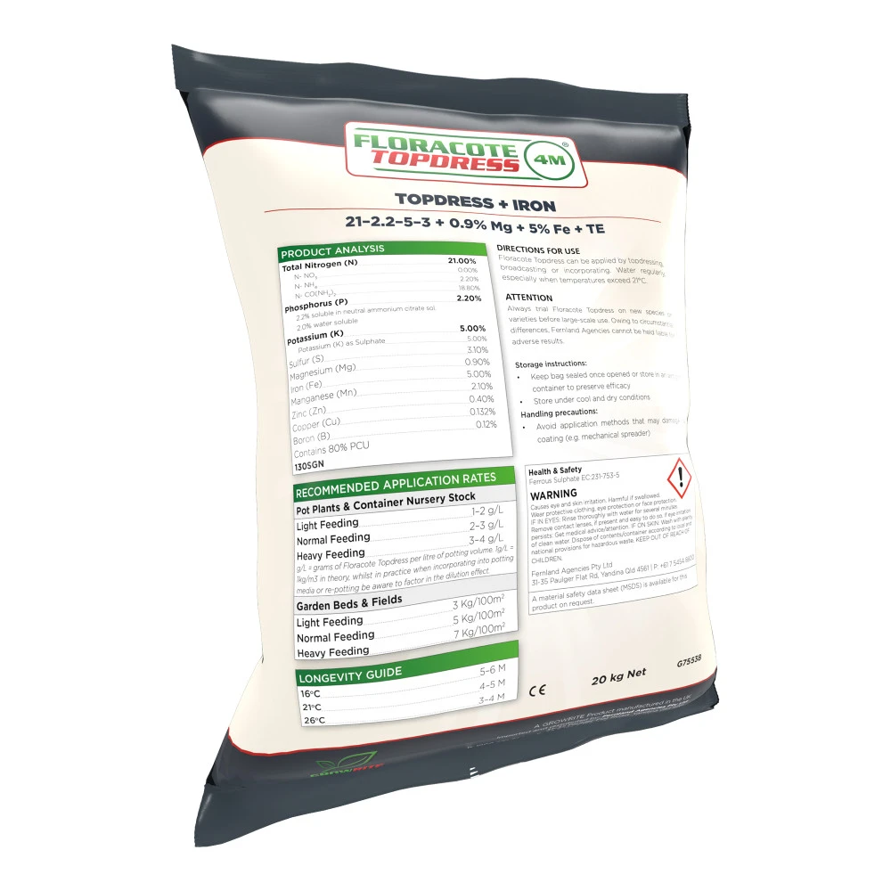 Floracote Topdress can be applied by topdressing, broadcasting or incorporating. Water regularly, especially when temperatures exceed 21°C.