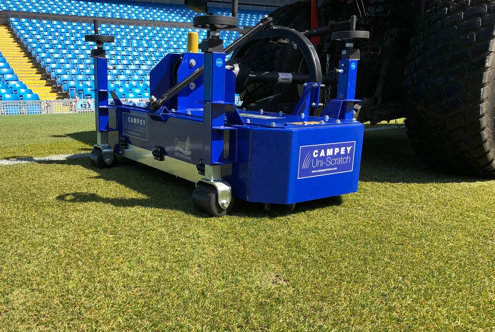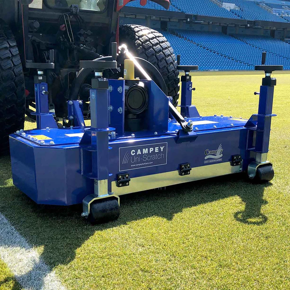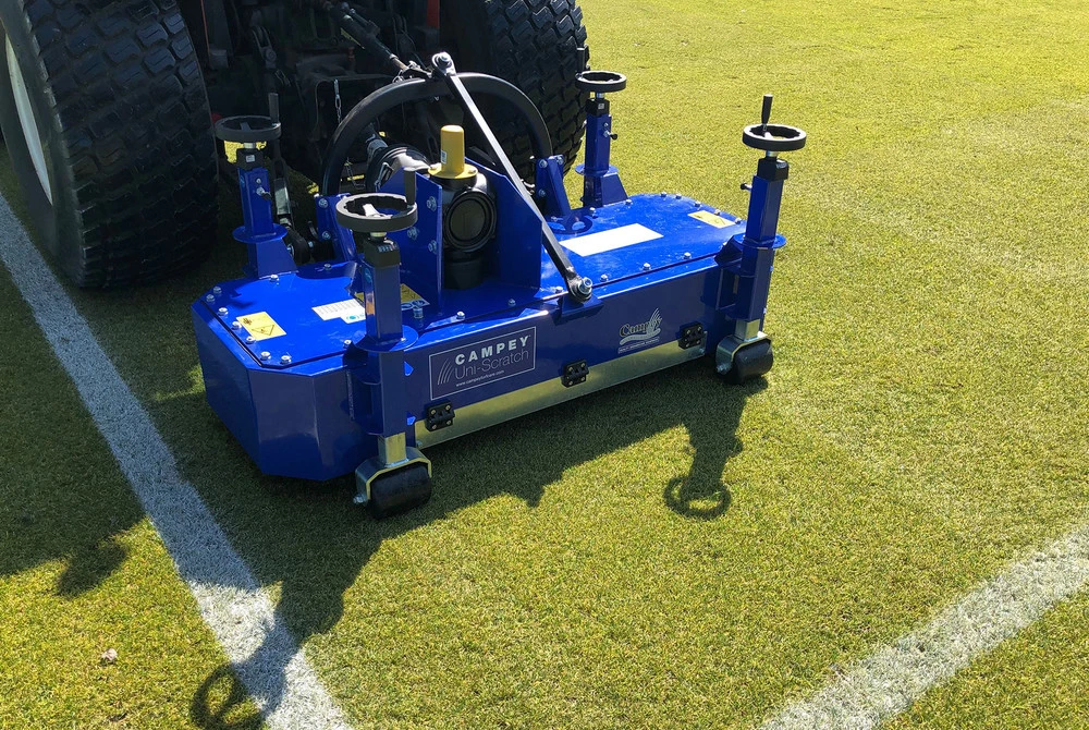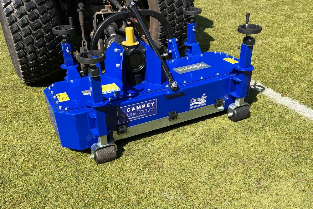 The Campey Uni-Scratch is the ideal solution for those looking for a professional and effective maintenance of natural and synthetic grass surfaces. The Campey Uni-Scratch has been developed to infill or refill when installing or looking after synthetic grass carpets. It can also be used for the final organic matter removal on natural grass hybrid carpet pitches when carrying out annual renovations. The Uni-Scratch moves on 4 supporting rollers which are adjustable in height to allow the most appropriate working depth. The rotors can be equipped with springs or linear brushes in PPL. Rear linkage to tractors of at least 30hp.